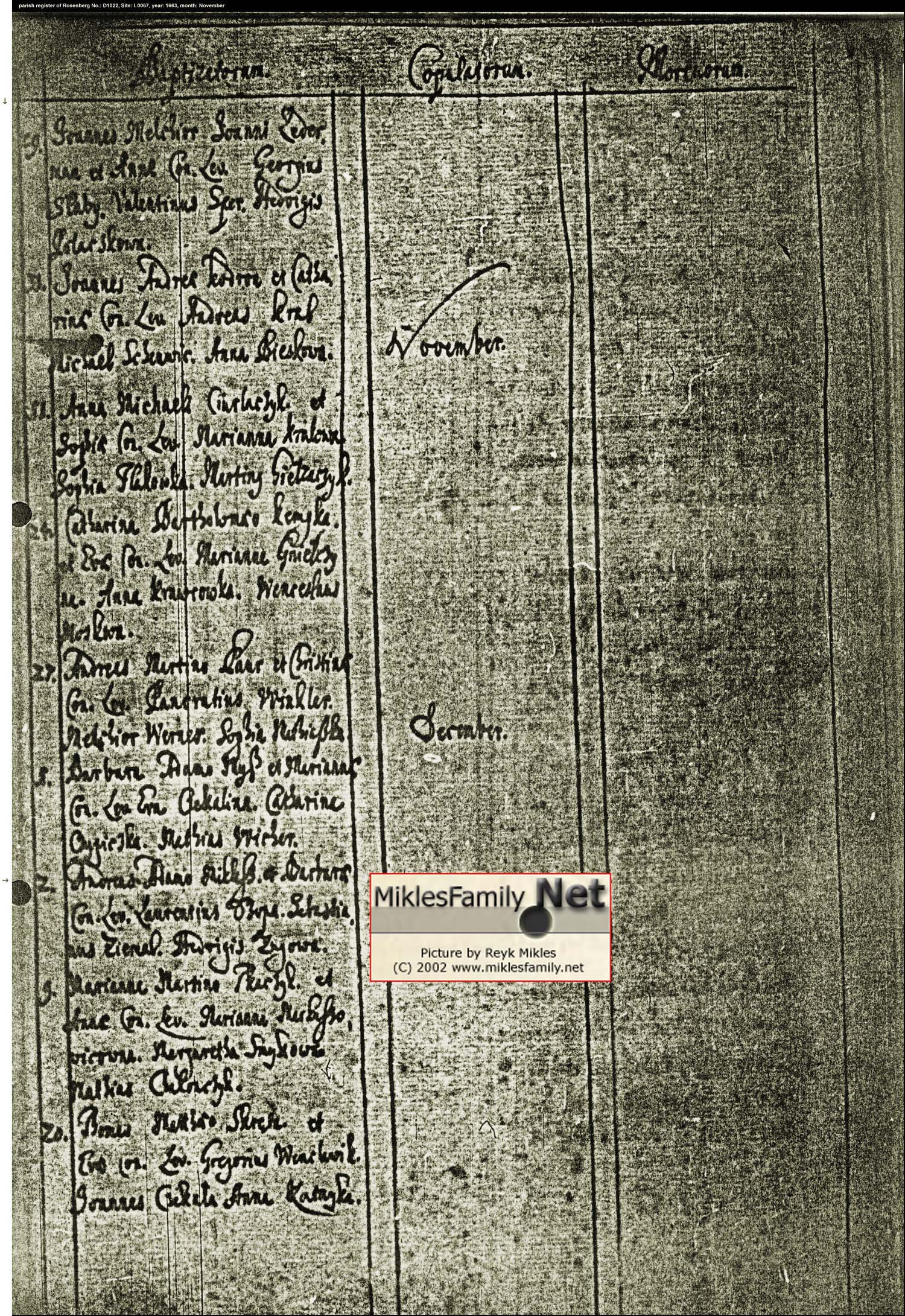Parish register November 1663 of the little village "Schönwald" in the county seat "Rosenberg" where Mikles lived.