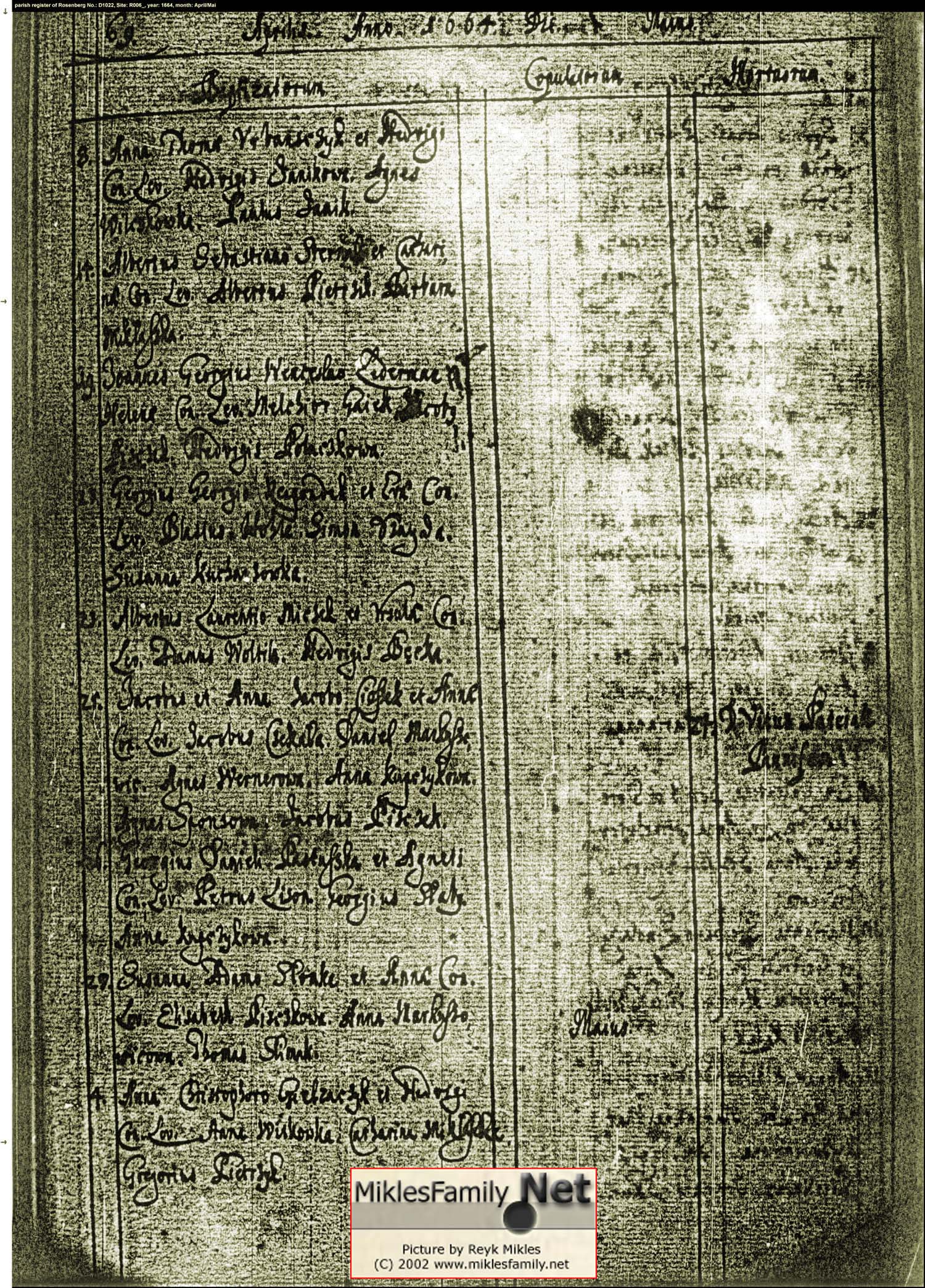 Parish register April/May 1664 of the little village "Schönwald" in the county seat "Rosenberg" where Mikles lived.
