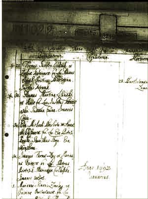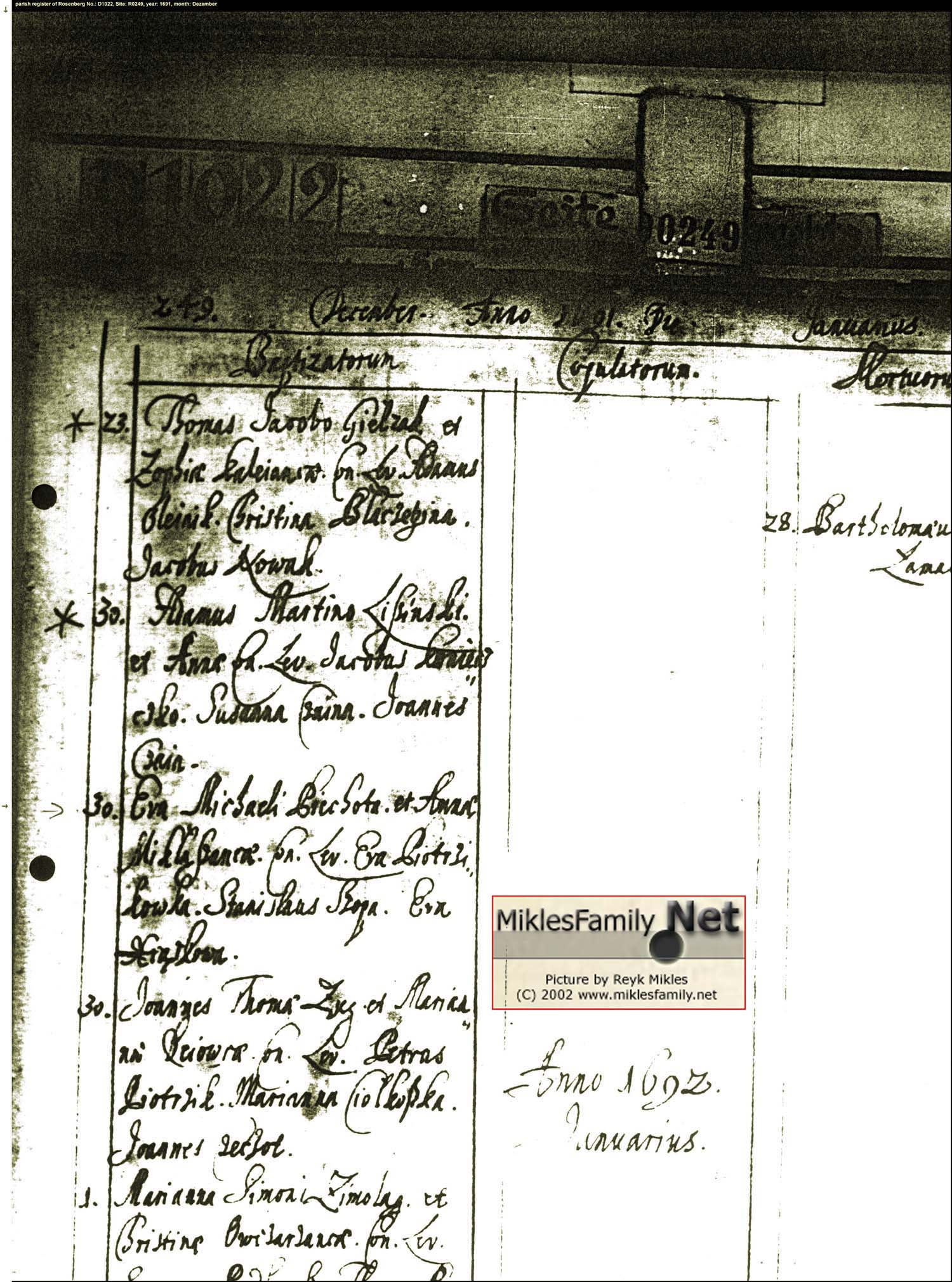 Parish register December 1691 of the little village "Schönwald" in the county seat "Rosenberg" where Mikles lived.