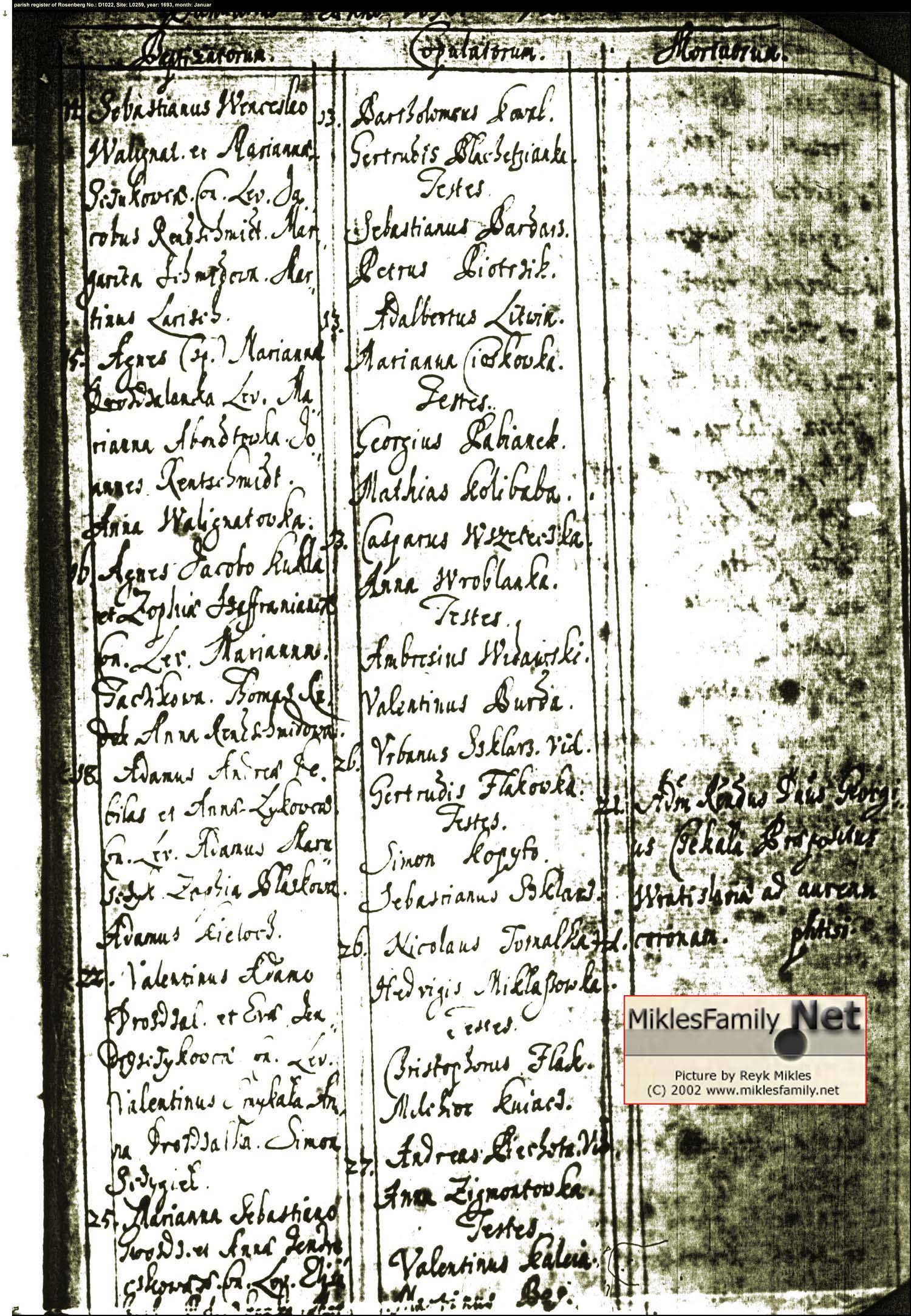 Parish register January 1693 of the little village "Schönwald" in the county seat "Rosenberg" where Mikles lived.