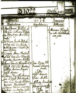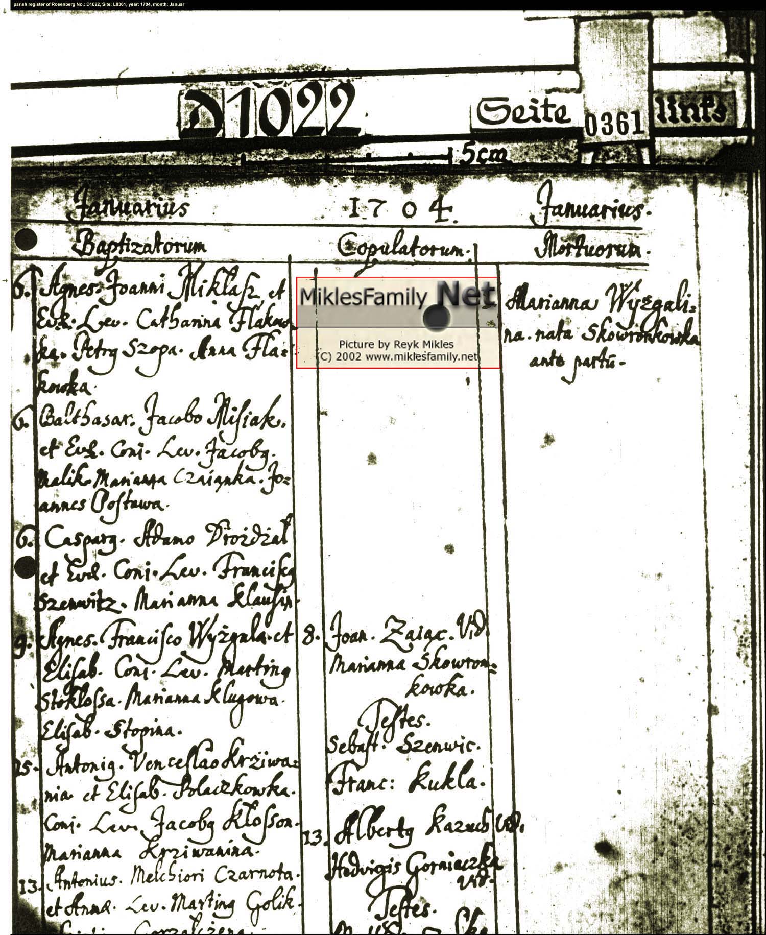 Parish register January 1704 of the little village "Schönwald" in the county seat "Rosenberg" where Mikles lived.