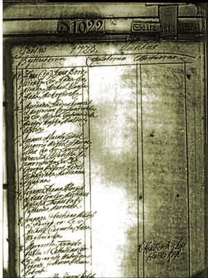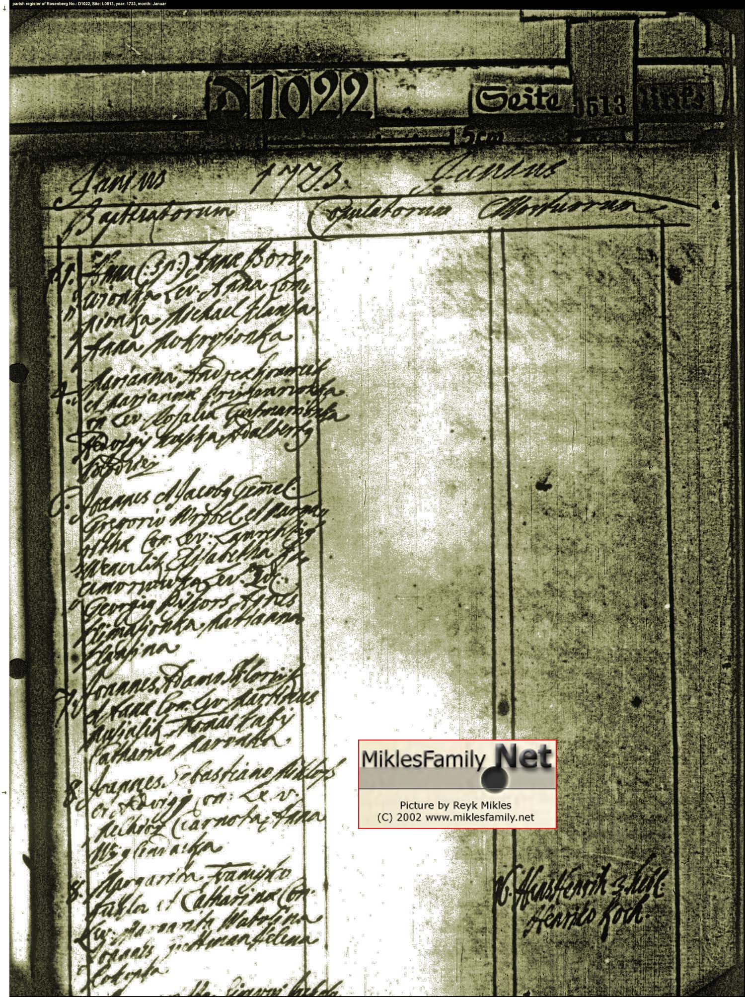 Parish register January 1723 of the little village "Schönwald" in the county seat "Rosenberg" where Mikles lived.