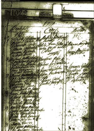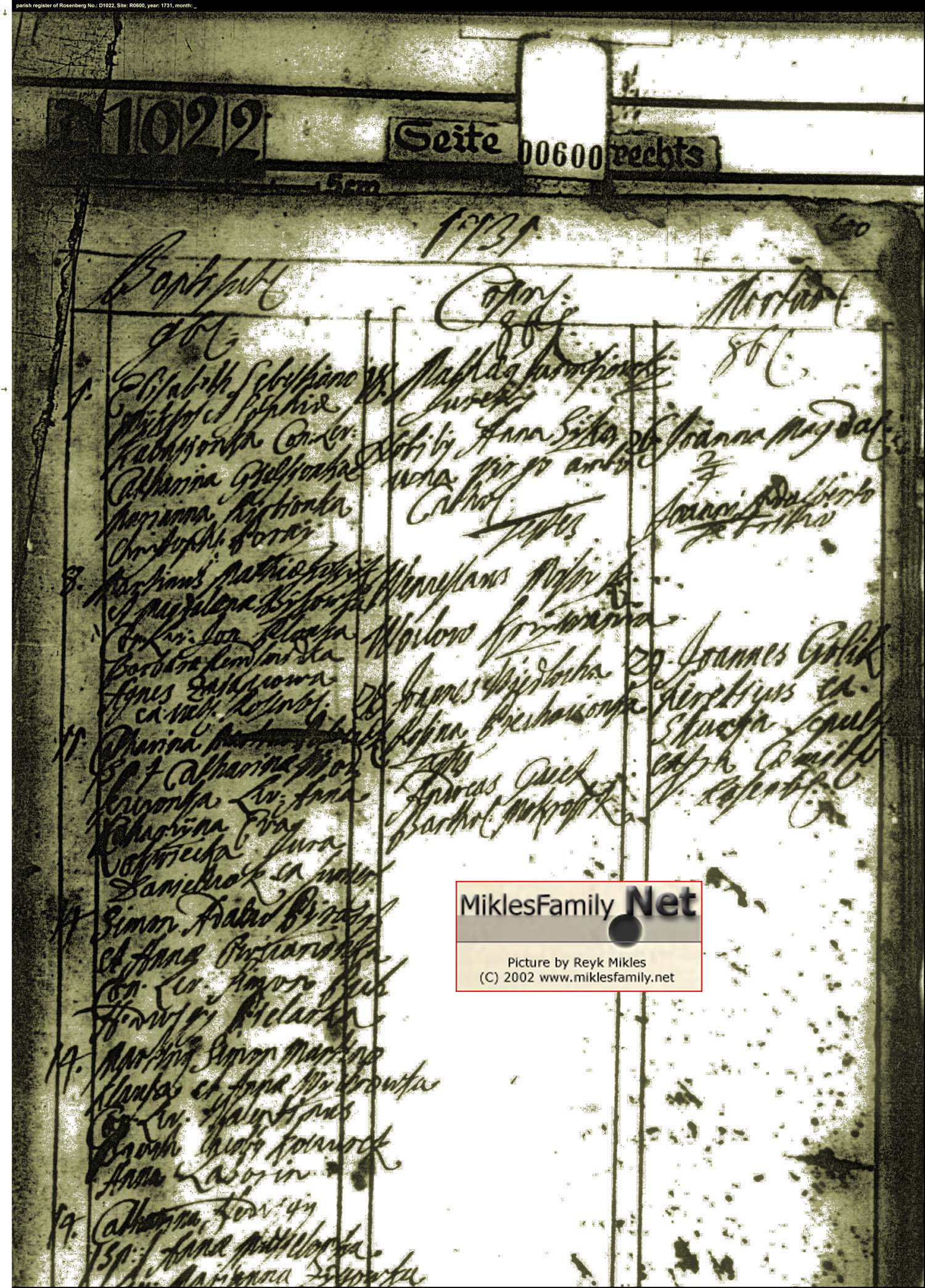 Parish register 1731 of the little village "Schönwald" in the county seat "Rosenberg" where Mikles lived.